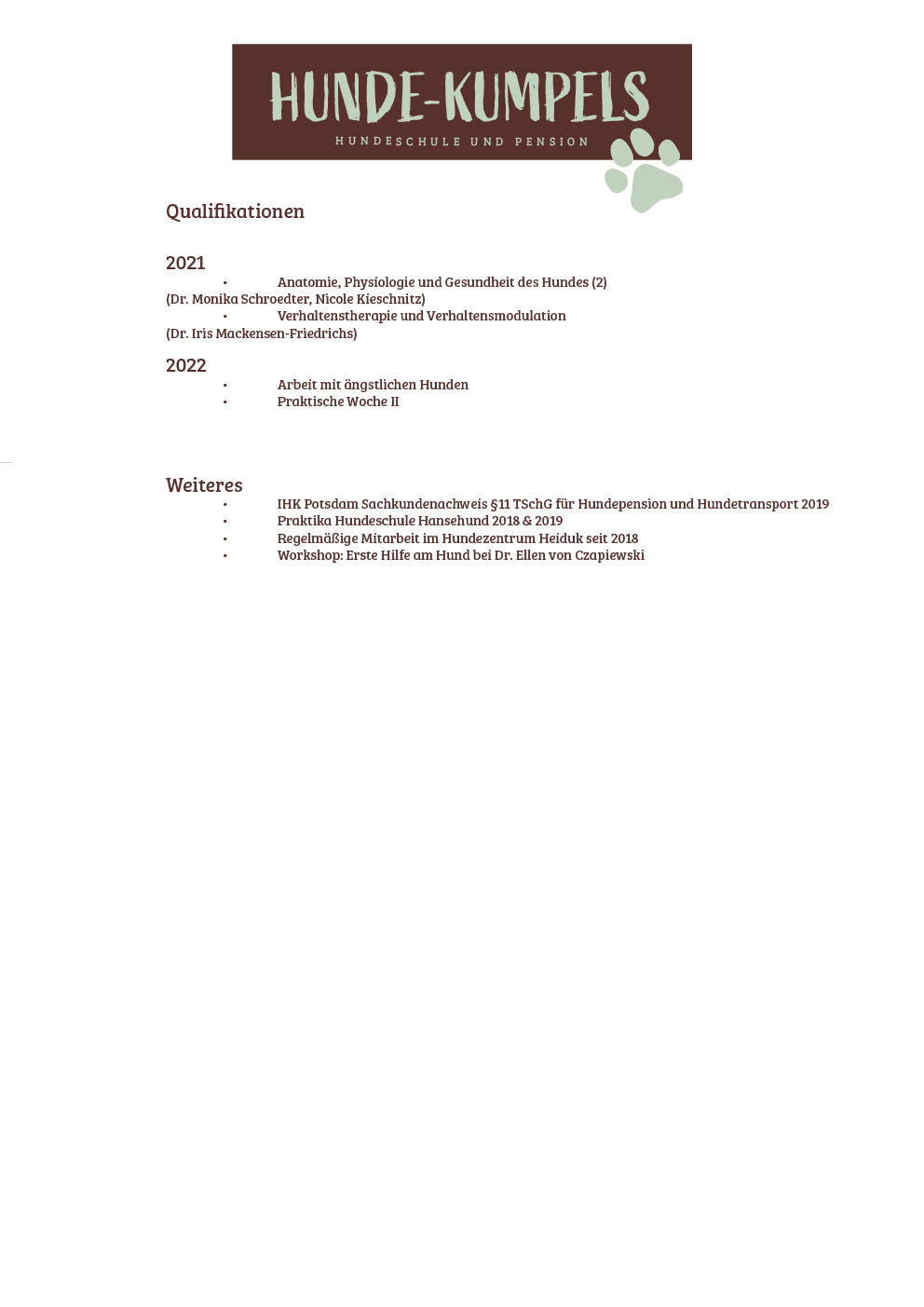 Neben großer Tierliebe und „Hunde-Verstand“ bringe ich diverse Ausbildungen mit. Ich bin beides, konsequente Trainerin und liebevoller HUNDE-KUMPEL.